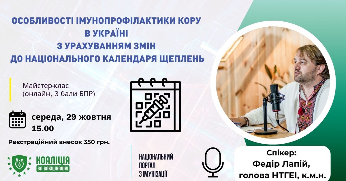 З 2026 року Національний календар профілактичних щеплень зазнає змін, що вплине на роботу всіх медичних працівників, дотичних до імунопрофілактики. ГС “Коаліція за вакцинацію” продовжує цикл майстер-класів, що допоможуть лікарям та медсестрам завчасно підготуватися до змін до Календаря та ефективно прокомунікувати зміни своїм пацієнтам. Майстер-клас 29 жовтня буде присвячено імунопрофілактиці однієї з найзаразніших інфекцій у світі – кору. Україна вже має досвід широкомасштабного спалаху кору, і під час повномасштабної війни особливо важливо попередити повторення цієї ситуації. Запрошуємо медичних працівників оновити свої знання з імунопрофілактики кору разом з головою Національної технічної групи експертів з імунопрофілактики Федором Лапієм, який безпосередньо дотичний до внесення змін до Календаря щеплень і зможе пояснити не лише самі зміни, а й їхню внутрішню логіку та відповідність світовим стандартам.